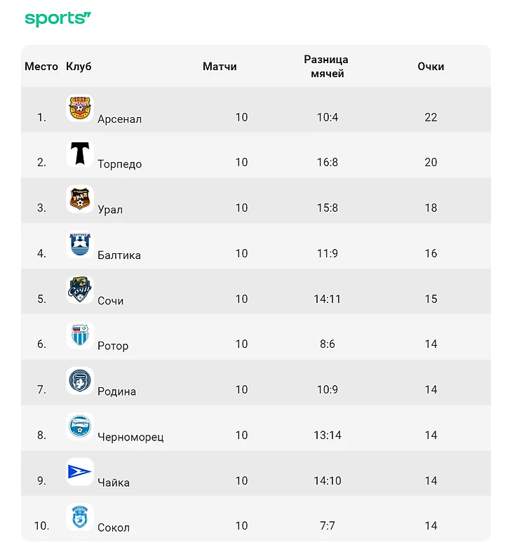 10 туров в Первой лиге: «Арсенал» и «Торпедо» – лидеры, но не фавориты, «Балтика» и «Сочи» мучаются
