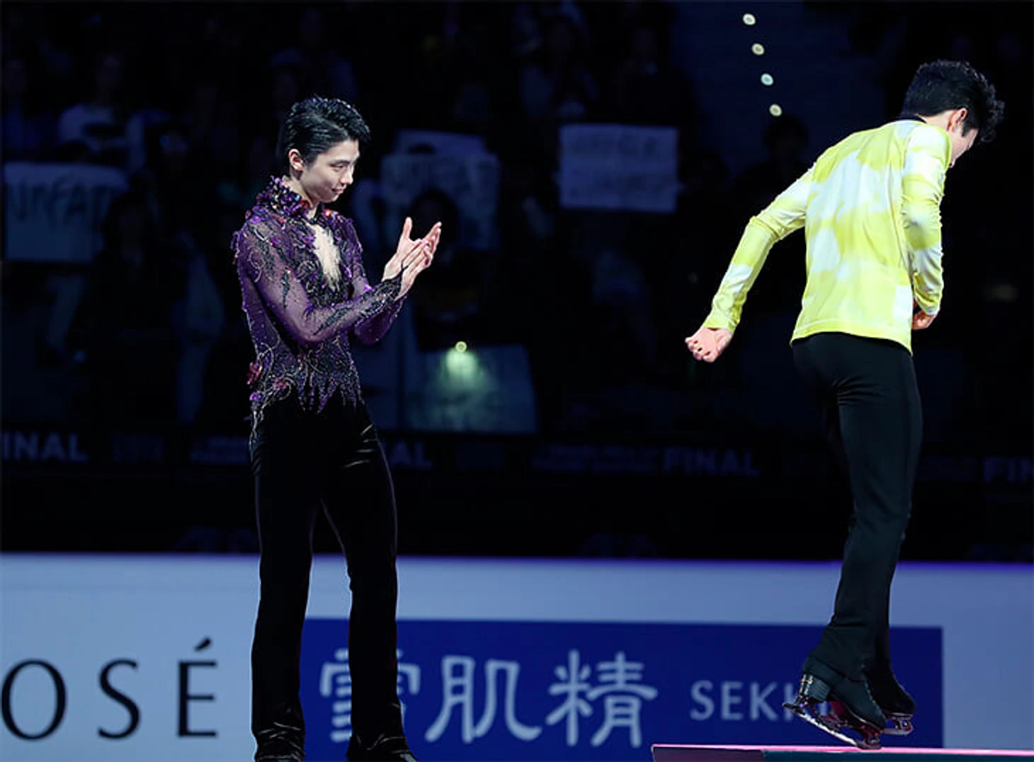 После короткой Ханю выглядел абсолютно счастливым: помогал собирать игрушки со льда, аплодировал тренерам в кисс-энд-крае и кричал из-за борта «Вперед, Джейсон» выехавшему на старт Брауну.