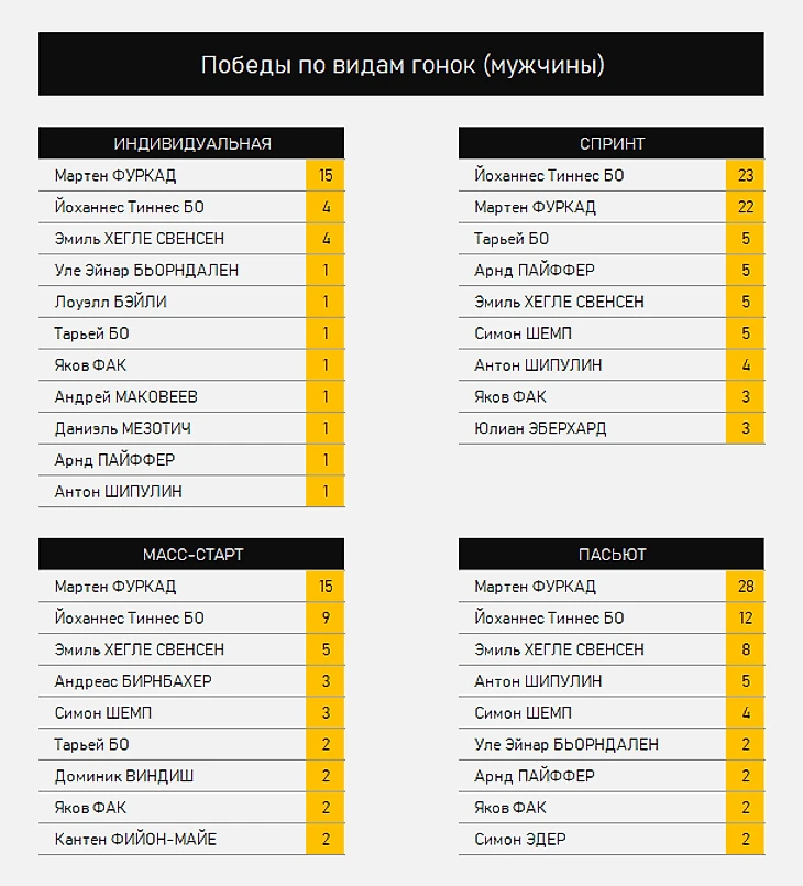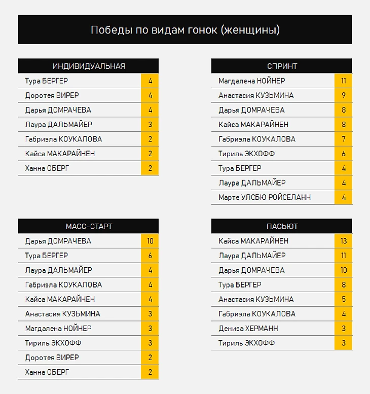 Ну и распределение побед между ведущими биатлонистками куда более демократичное, чем в авторитарной фуркадовской десятилетке.