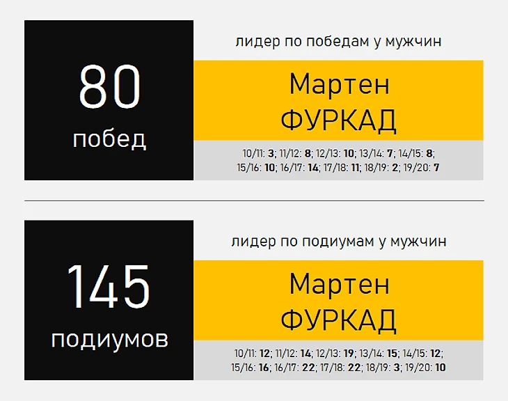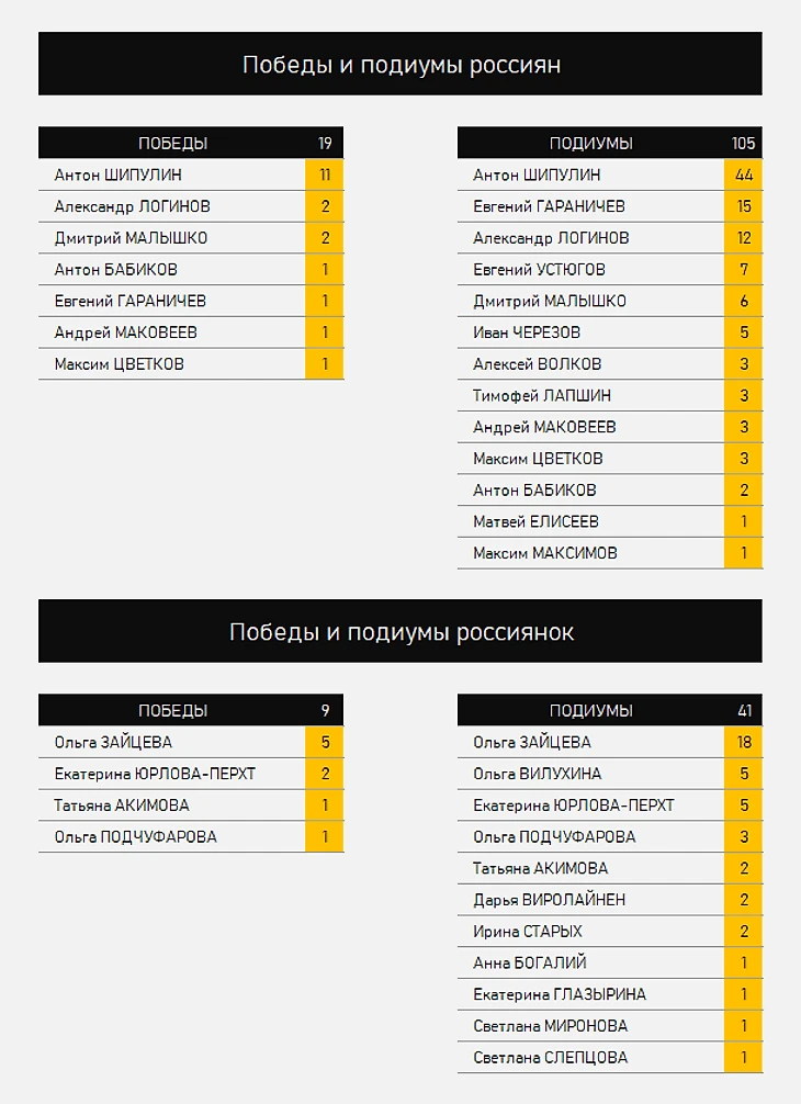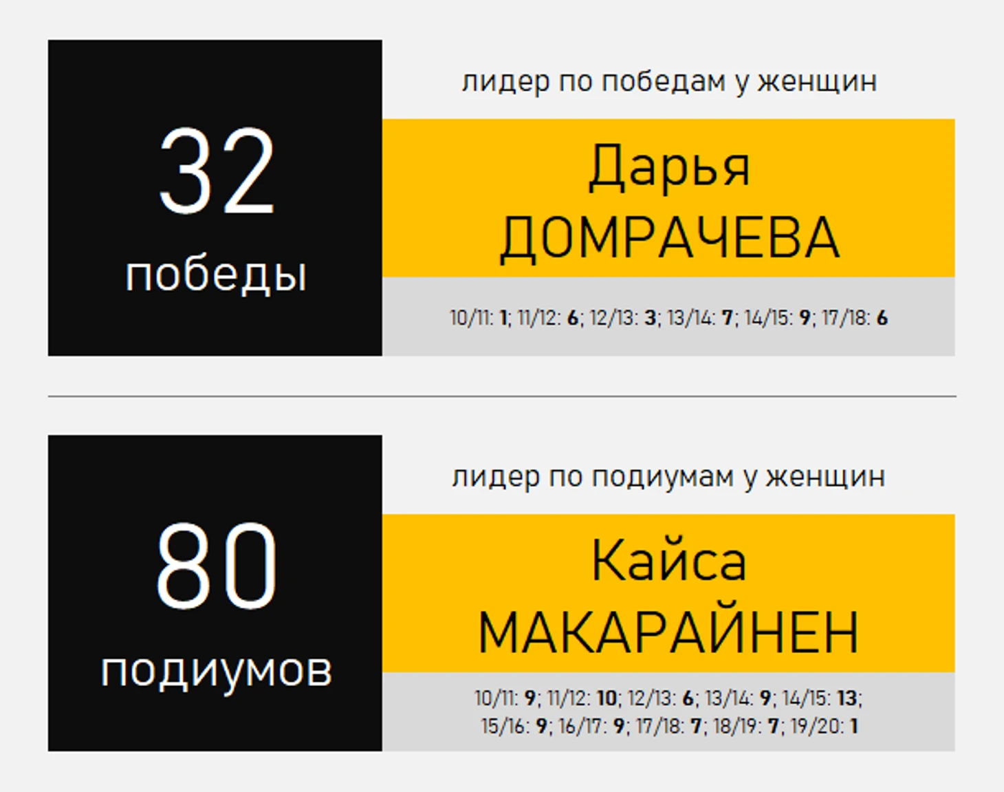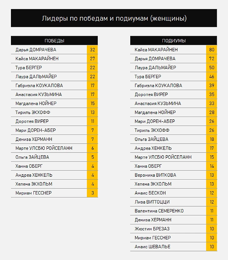 Теперь — к дамам. Здесь разнообразие начинается уже с лидеров по победам и подиумам.