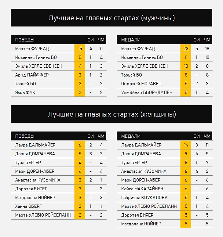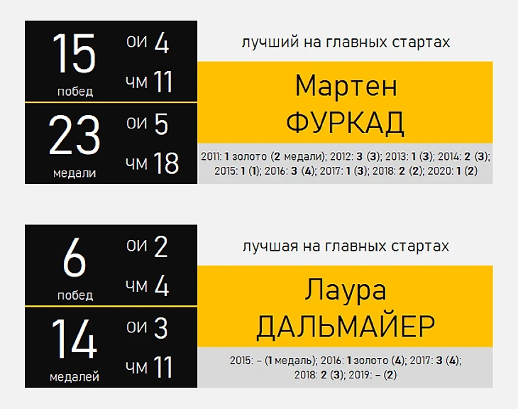 А кто же показал наибольшую эффективность на главных стартах — двух олимпиадах и восьми чемпионатах мира? Для контекста: Фуркад участвовал во всех 40 личных гонках, Дальмайер — в 23-х. И результативность Лауры на чемпионатах мира — фантастическая: 11 подиумов в 16 гонках, а худшее место — седьмое.