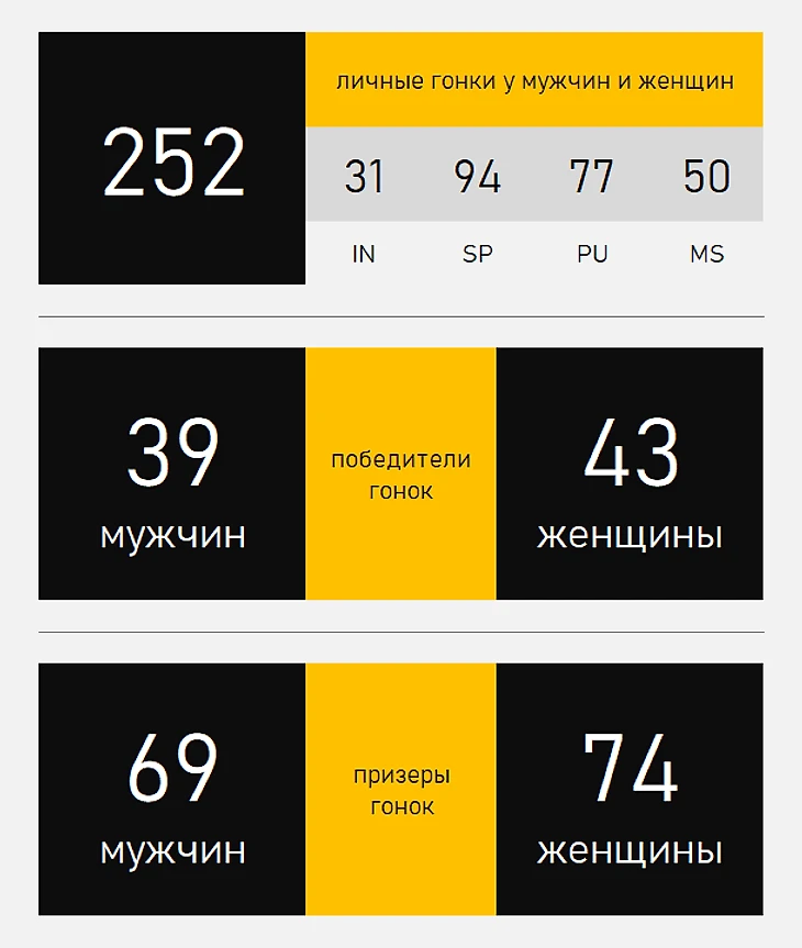 Для начала — самые общие цифры по гонкам, их победителям и призерам.