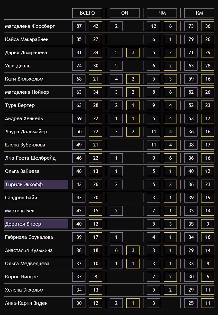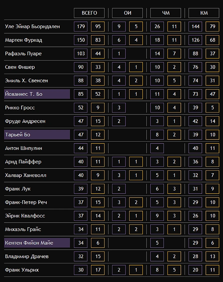 Тарьей Бо уже в топ-10 в истории мужского биатлона, Тириль Экхофф и Кентен Фийон Майе также продолжают подниматься по исторической лестнице. Это резюме минувшего сезона, а дальше — только цифры (помимо подиумов указано еще и количество побед). Смотрите и оценивайте сами.