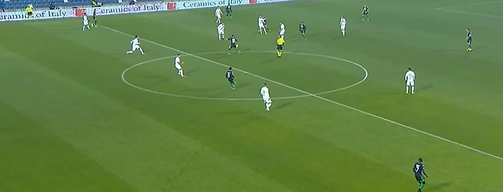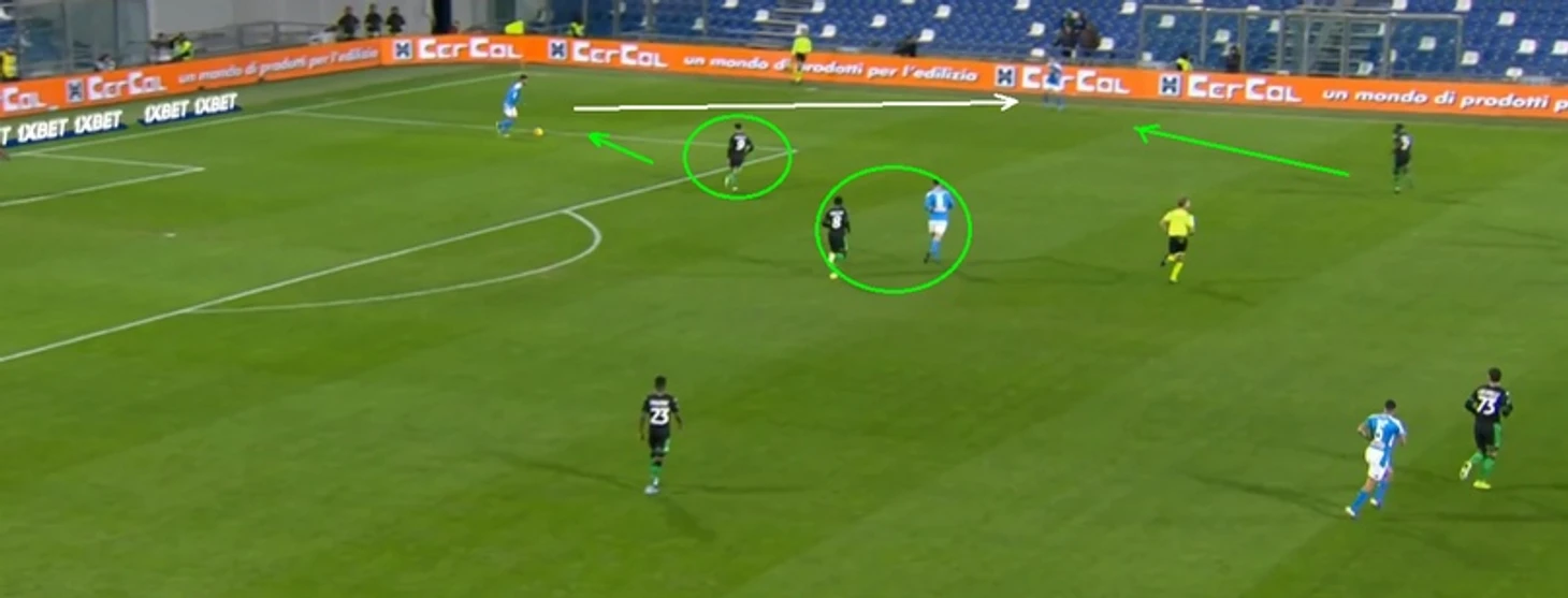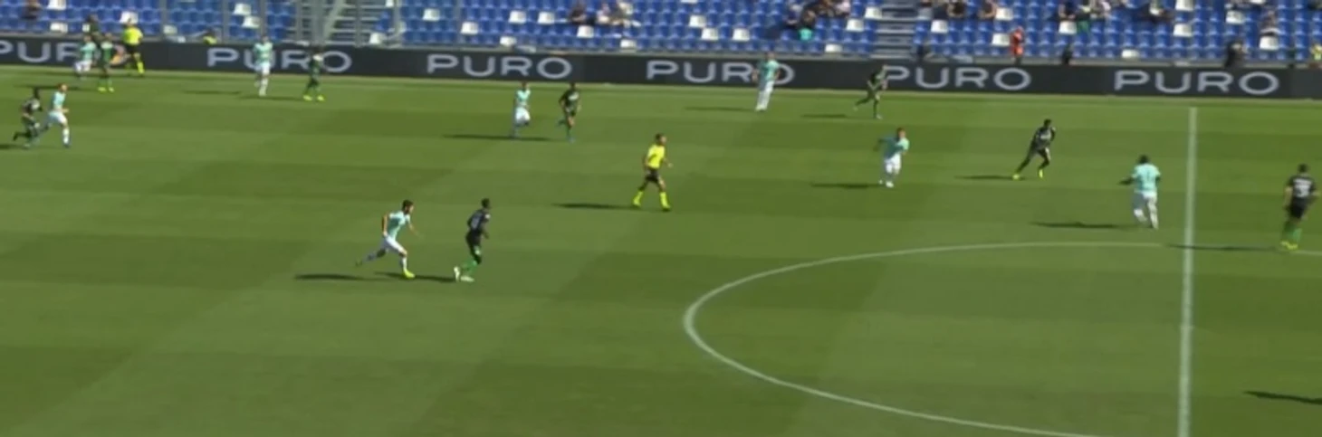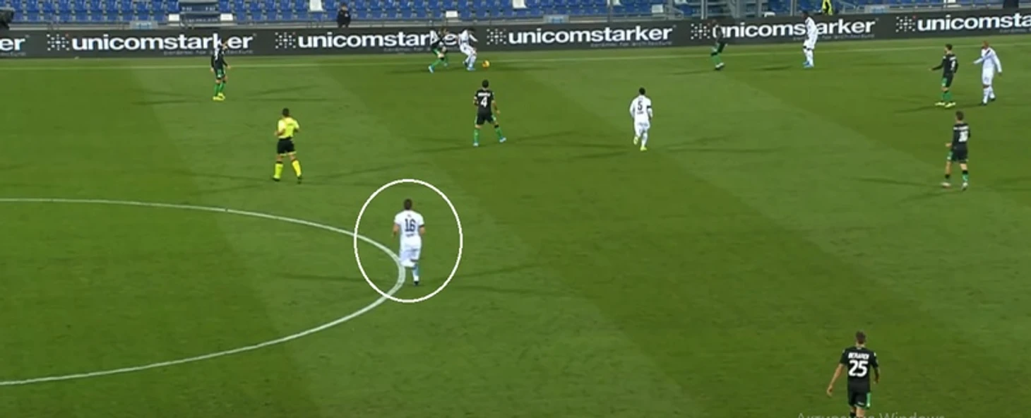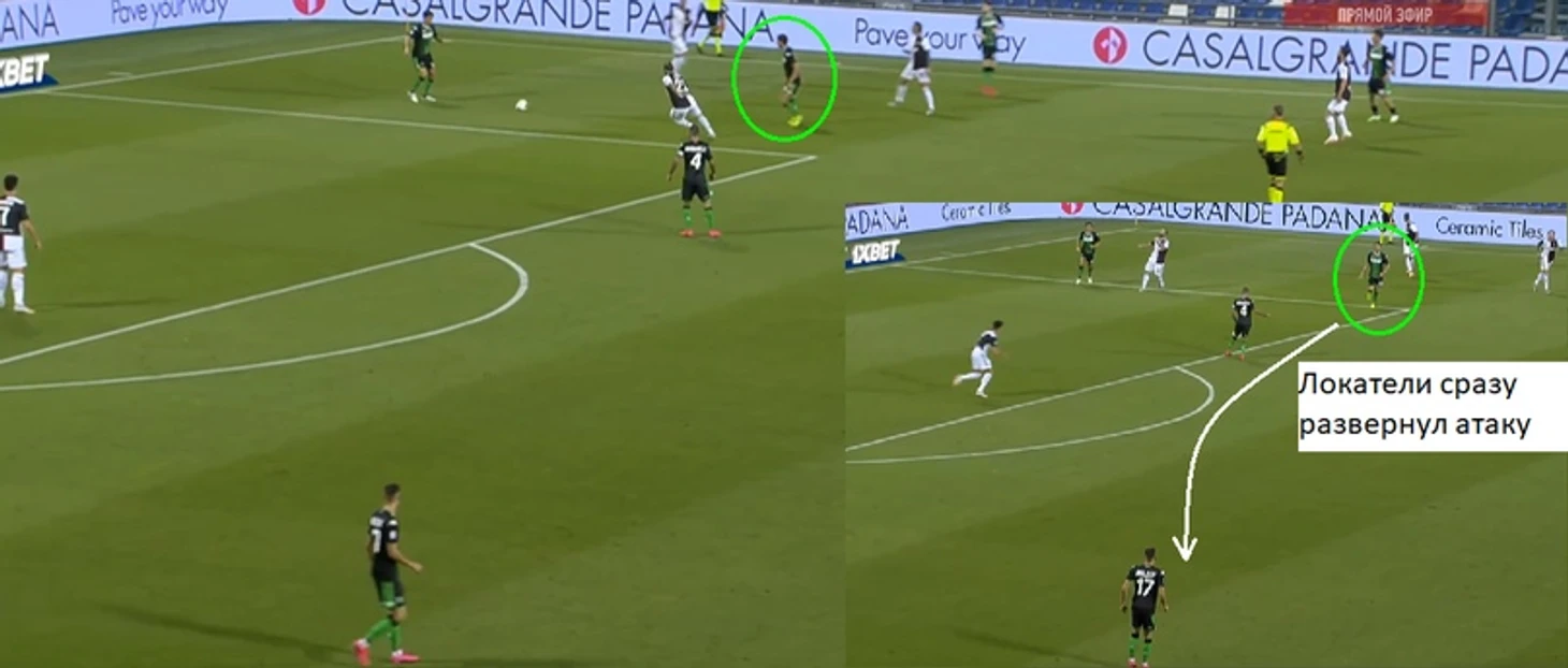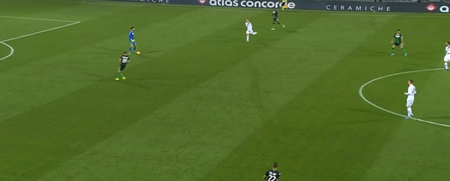 Тогда за спиной оппонентов открывается или Траоре, или Джуричич, которые практически всегда имеют пространство для движения с мячом. Помимо этого есть и еще одно наблюдение — игроки « Сассуоло» открываются лицом к воротам, что позволяет им проводить быстрые контратаки после отбора мяча или развивать свои атаки в случае выманивания на свою половину: