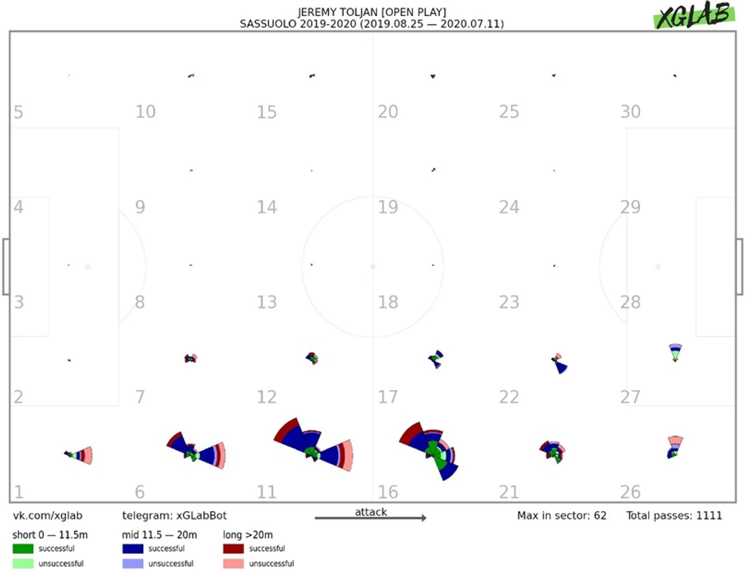 Видно, что Локателли и Маньянели выполняют поразительную работу по продвижению мяча в этом сезоне ( особенно первый). Хорошо видно, что Бога и Берарди отлично проявляют себя в финальной стадии ( хотя, качество дриблинга около незначительно выше 50% у обоих). Мы не будем отдельно касаться последних двух ( и Капуто в придачу), об их игре в сезоне уже достаточно написано и сказано, ограничимся только статистическими данными: