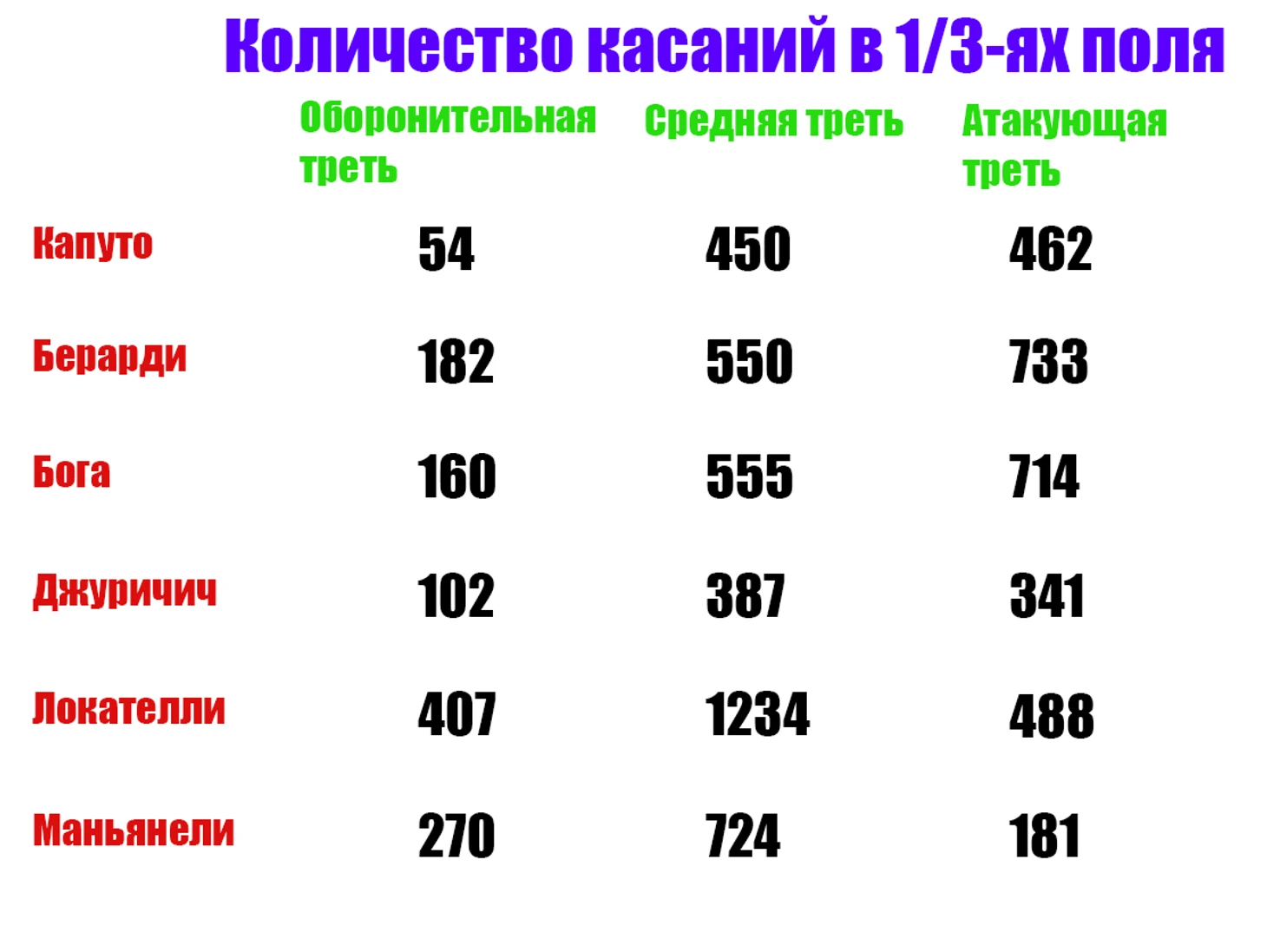 Последнее, чего мы коснемся — количество касании в разных третях поля и вовлеченности в игру, по этому можно проследить четкую концепцию игры « Сассуоло»: