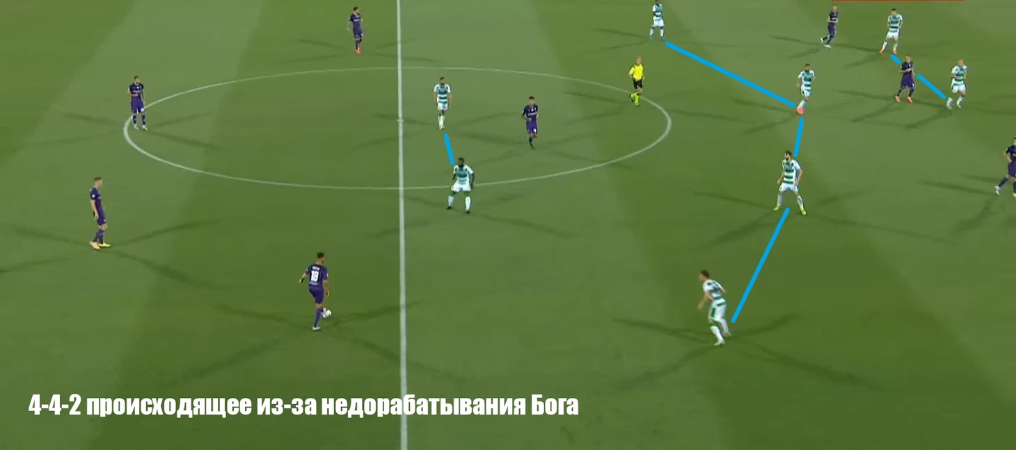 Такие моменты возникают из матча в матч. Несмотря на всю активность прессинга, центральный защитник не всегда до конца следует за игроком. Добавим, что еще не соблюдается до конца компактность, поэтому такие ситуации и возникают: