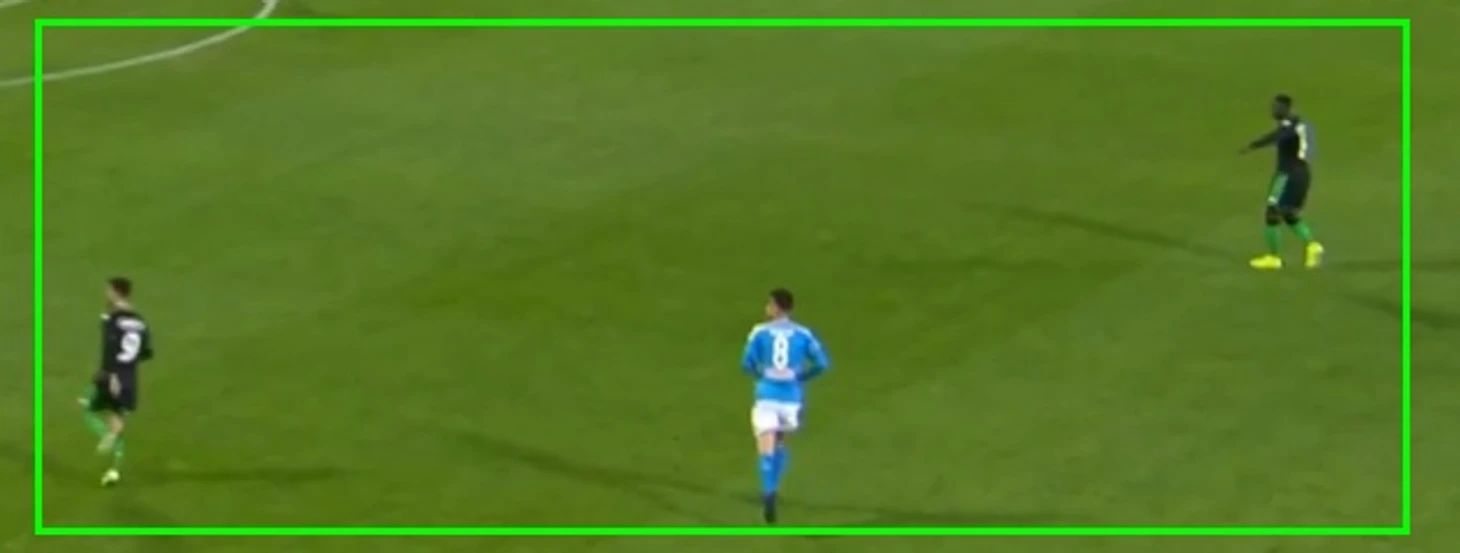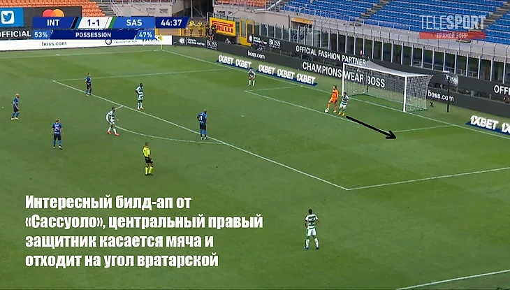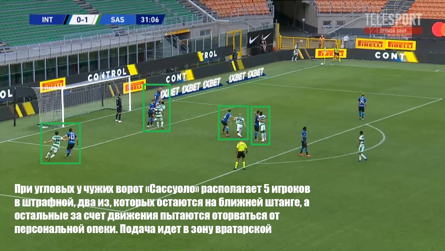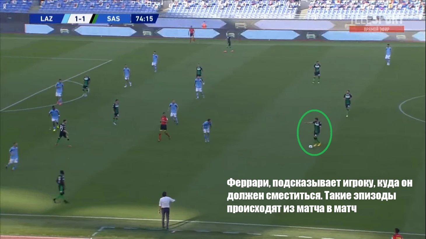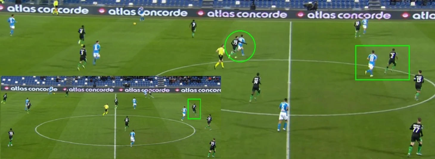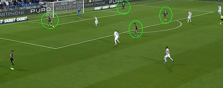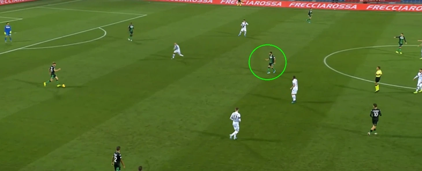 «Сассуоло» строит игру по принципам позиционного футбола(подробнее https://spielverlagerung.com/2014/12/25/juego-de-posicion-under-pep-guardiola/). Обратим внимание, что вся линия защиты не поднимается высоко, а остается на своей половине поля ( с опустившимся ниже Маньянелли), создавая с вратарем структуру 1 -2-3 в начальной фазе и 3-2-3-2 ( или 2-3-2-3 в зависимости от насыщенности центра поля у команды противника). Помимо этого обратим внимание — везде система « треугольников», которая помогает лучше продвигать и контролировать мяч. Это помогает выманивать соперника ( на скриншоте вообще 8 игроков « Сассуоло» в кадре) и позволяет иметь пространство между линиями, если прессинг оппонента не удался или был не слишком активным: