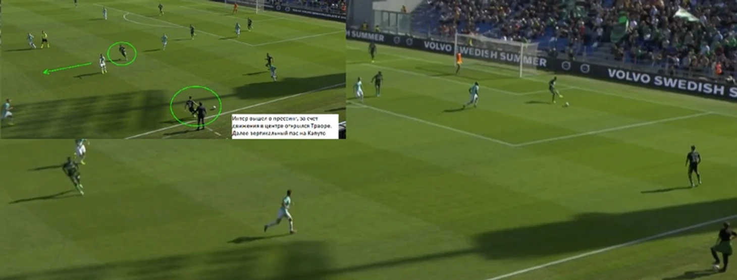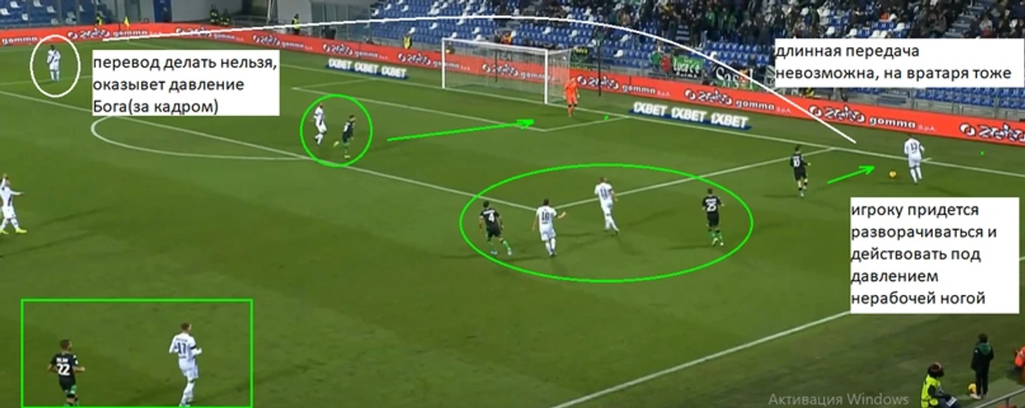 А здесь уже Капуто перекрывает обратную передачу, « Сассуоло» заманивает соперника во фланг:
