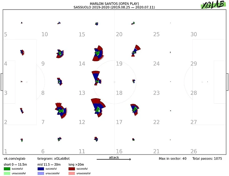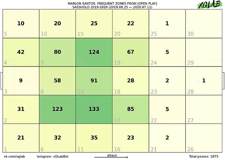 Стиль « Сассуоло» и разъяснения тренера из штаба Де Дзерби еще раз говорят о идее, в которую верит главный тренер — доминирование через пас. Стоит отдельно выделить, что команда всегда пытается выйти через короткий розыгрыш, предпочитая ему вынос мяча. В этом помогает любой из ЦЗ; Де Дзерби, вероятно, просит чтобы те чаще отдавали вертикальный пас в атаку, чем статично передавали его друг другу. Вот, например, сонары передач Сантоса: