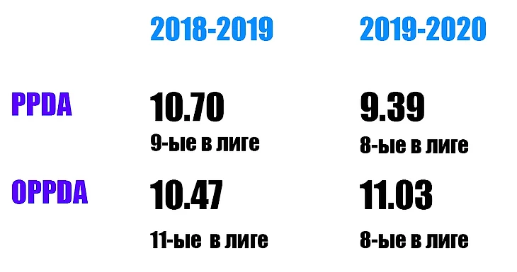 Напоминаем, что PPDA показывает количество передач или действий с мячом соперника под прессингом, а OPPDA — наоборот, сколько Ваша команда делает действий с мячом под прессингом. На картинке выше видно, что « Сассуоло» улучшил интенсивность своего прессинга в этом сезоне ( но далеки от идеала и уступают, например, « Болонье») и улучшил контроль и продвижение мяча под давлением. Это уже говорит о том, что Де Дзебри работает над этими компонентами. Тут же стоит отметить и процент высокого возвращения команды мяча под свой контроль — 29% успешных попыток.
