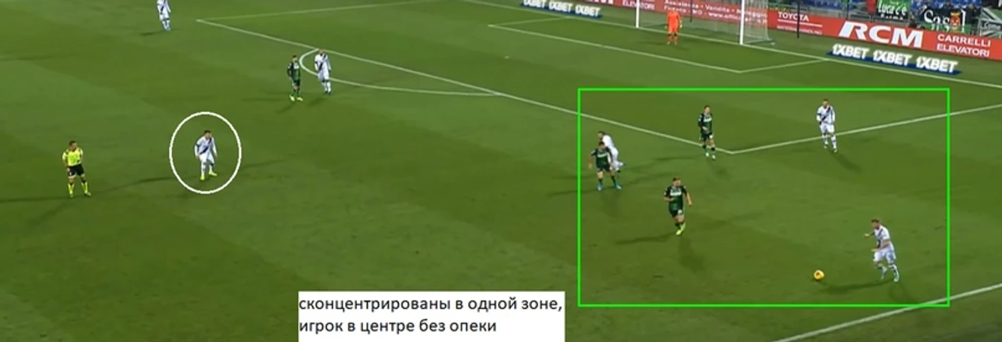 В итоге получается следующая картина: « Сассуоло» агрессивно давит соперника во флангах, но при этом получается, что в центре постоянно остается без опеки один из игроков чужой команды. Смотрим: