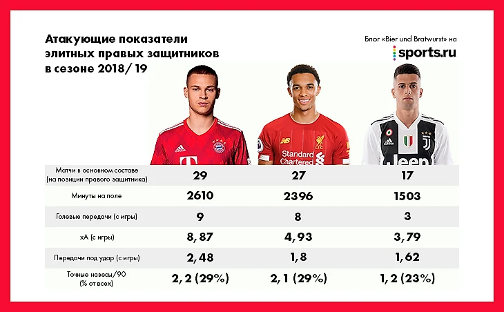 Лучше всего уровень атакующей игры Киммиха (выдающийся!) может продемонстрировать его прямое сравнение с другими элитными крайними защитниками: Трентом Александром-Арнольдом и Жоао Кансело. Если у игрока «Ливерпуля» в плане его ассистов заметен некоторый овеперформанс (разница «A-xA» составляет почти три), то Киммих набрал ровно столько ассистов, сколько модель прогнозировала. Подает с фланга Киммих тоже на элитном уровне: он не боится навешивать часто, и делает это с высокой степенью эффективности.