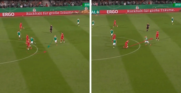 «Вердер» – «Бавария». Крузе пытается прессинговать Киммиха, Йозуа легко разворачивается и успевает отрезать второго набегающего игрока (Классена) пасом на партнера.