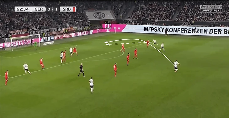 Киммих находится далеко от штрафной, и имеет достаточно времени для того, чтобы проанализировать ситуацию и отдать отличный проникающий пас на Горецку, который отметится голом.