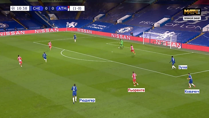 Пример полезного движения Ковачича. Смещение Матео налево перегрузило зону для «Челси». Льоренте остался один против троих соперников.