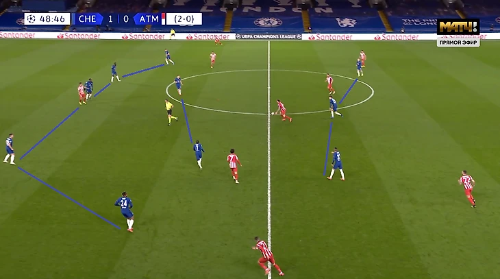 При этом Симеоне не продумал прессинг на качественном уровне. Да, он придал передней группе четкие задачи. Льоренте постоянно выбрасывался на крайнего центрдефа «Челси», а Феликс чаще сохранял место в опорной зоне. Но все установки «Атлетико» работали без учета особенностей системы Тухеля.