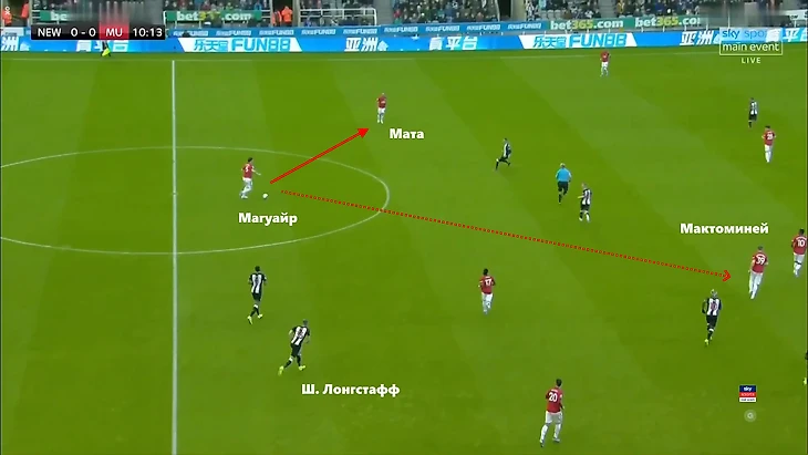 Примерно до середины второго тайма «дьяволы» пытались развивать бОльшую часть своих позиционных наступлений через центр. При высоком прессинге со стороны «Ньюкасла» на помощь к Магуайру и Туанзебе опускались Мактоминей и Фред (в критических ситуациях к ним присоединялся Мата). В случае отсутствия давления опорники «Юнайтед» располагались между первой (Жоэлинтон и, от случая к случаю, Сен-Максимен) и второй линиями соперника и чаще всего пытались расчистить пространство для передачи на Мату или опускавшегося Рэшфорда.