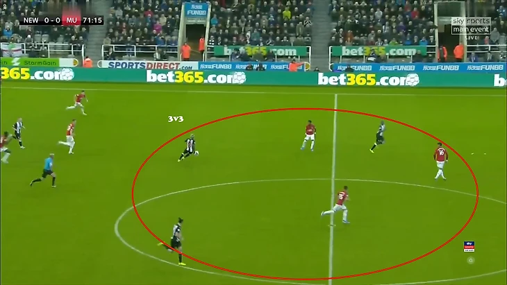 Любопытно, что свою вторую победу в чемпионате «Ньюкасл» также добыл в поединке с командой, на данный момент имеющую серьезные пробелы в системах прессинга и контрпрессинга. Как и в случае с «Тоттенхэмом», критической отметки этот дефект достиг во второй половине встречи, когда «МЮ» стал оказывать более агрессивное давление на защитную линию соперника. Ситуация на скрине ниже отображает полный деструктив в организации высокого давления «дьяволов». Во-первых, Перейра очень поздно выдвинулся на Шера и не имел никаких шансов накрыть длинную передачу. Во-вторых, Фред и Мактоминей зависли в полупозициях – не пытались накрыть центральных полузащитников «сорок» и не возвращались для оказания своевременной помощи обороне. В-третьих, подключение Виллемса в атаку осталось незамеченным и помогло создать преимущество 4v3 слева. Йедлину в этой ситуации не хватило расторопности и техники – при более быстром принятии решения эпизод бы завершился гораздо интереснее, чем ударом Энди Кэрролла мимо ворот.