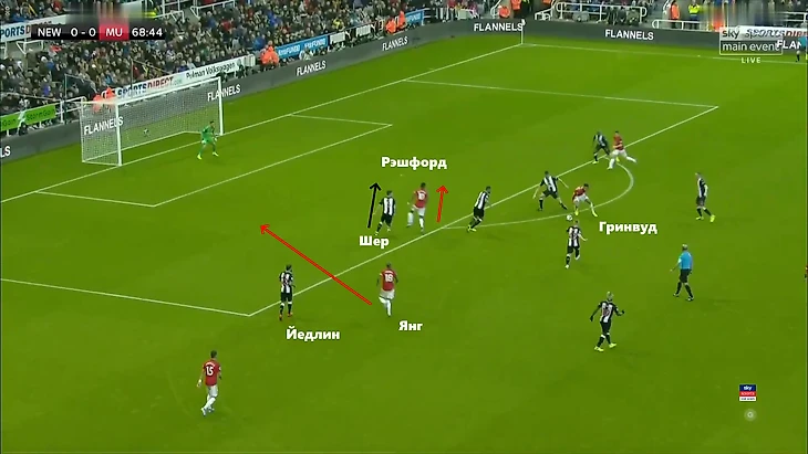 Как самостоятельная оборонительная единица американец по-прежнему очень слаб. На скрине ниже представлен наиболее красноречивый пример неумения Йедлина читать игру в защите. Рэшфорд увел Шера в центр (едва ли не самое полезное действие англичанина за весь матч), расчистив пространство для открывания Янга, Йедлин любуется Гринвудом и не сужает, капитан «МЮ» упускает один из наиболее опасных моментов своей команды за всю игру.