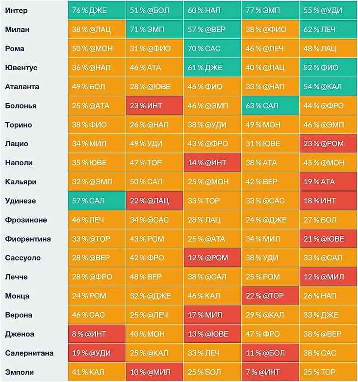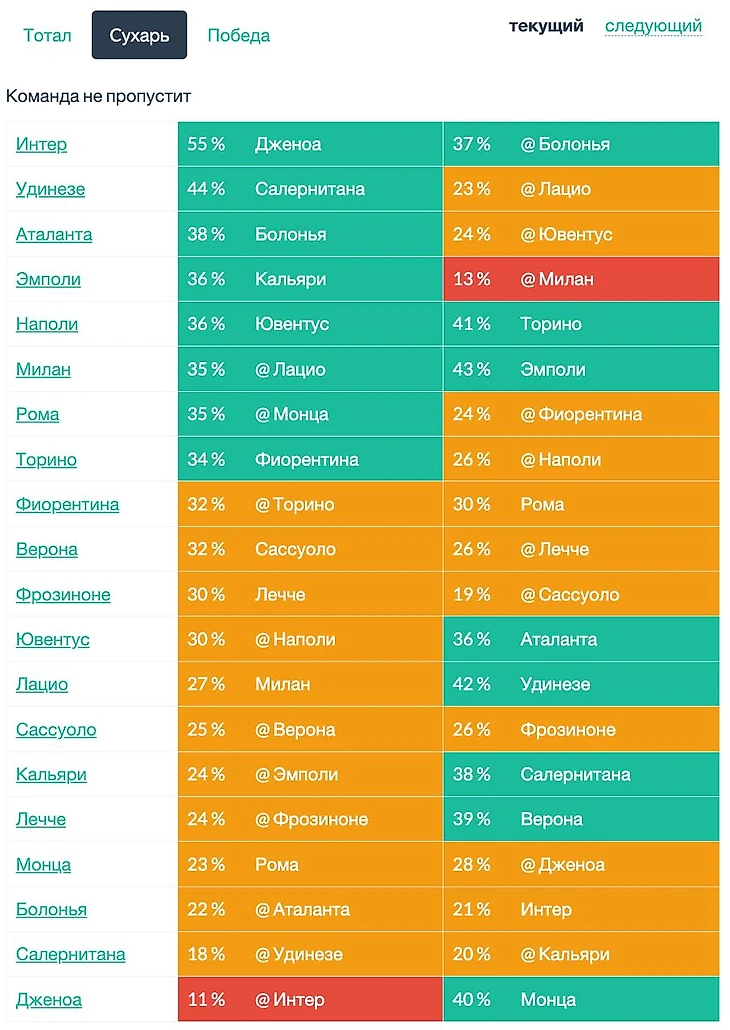 Выделю команды, которые, скорее всего обрушат сухари в «зелёной» зоне. Это «Фиорентина», которая по игре должна была громить «Лацио», а также «Болонья» - защита «Аталанты неидеальна. Безусловно, шансы будут и у «Юве», и у «Лацио». Я бы опирался на защитников из «Интера», «Удинезе» и «Ромы».