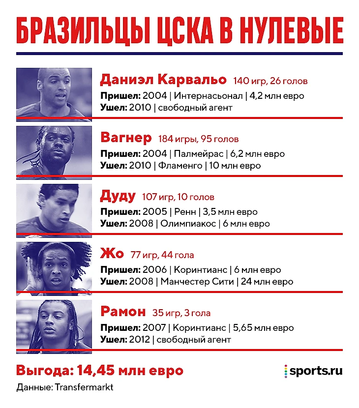 На фоне Вагнера, Карвальо и Жо размыто выглядел Дуду и совсем испарился Рамон. ЦСКА хотел взять Дуду сразу после юношеского чемпионата мира, но подобрался только в 2005-м, потому что сначала игрок пугался России. «Я играл за «Виторию», и там был русский человек, который мне сказал: тебя хочет подписать ЦСКА, русская команда, которая в ближайшее время станет клубом мирового уровня, – вспоминал бразилец. – Я в тот момент не имел ни малейшего представления о России и проигнорировал разговор. А потом поехал во Францию, и там мне снова сказали про ЦСКА, назвали сумму контракта. Тогда я решил: ну что ж, надо думать о своей карьере».