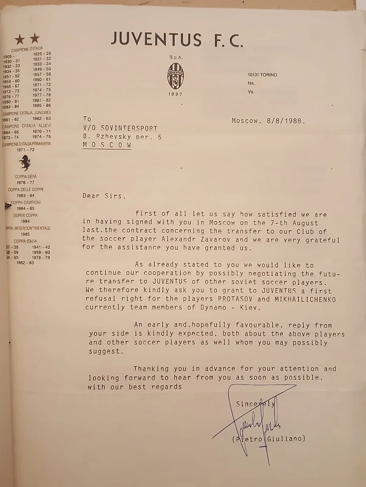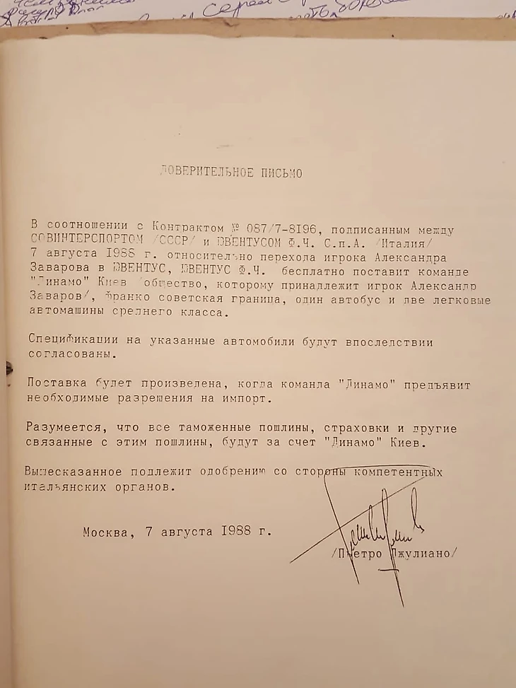 – Это отличный пример, потому что дело Заварова хранится у меня дома. Если вас интересует, у меня есть подробнейший файл со всей перепиской с итальянцами, подготовкой контракта, торгами, дополнительные документы – про бонус в виде машины, автобусы для «Динамо» и так далее. Там понятно, почему 5 миллионов, а не 3. Есть письма Валерия Лобановского.