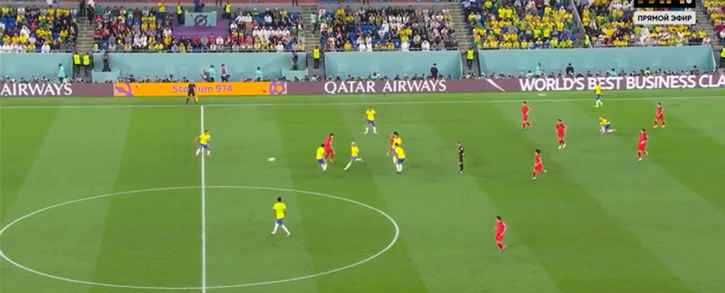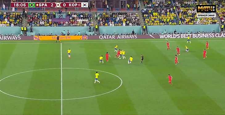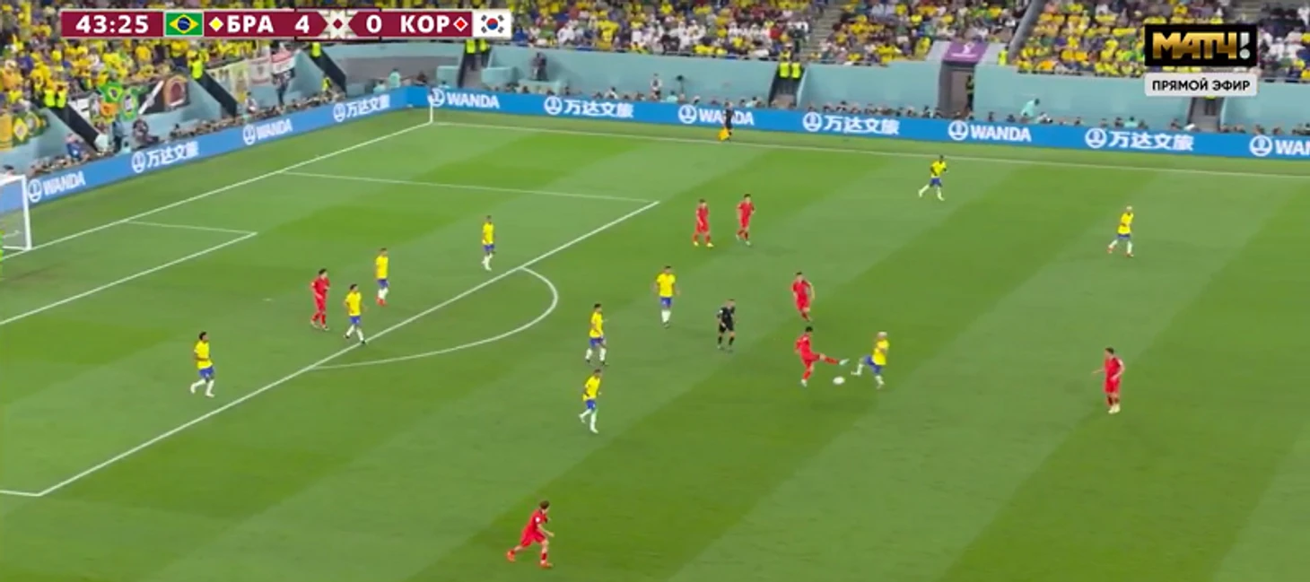 4. 44-я минута. 4:0, интрига уничтожена. Корейцы второй раз грузят мяч к штрафной Алиссона, пытаясь поймать момент в воздухе, но бразильцы отбиваются. И кто же срывает второй темп? Ришарлисон спускается с чужой половины и не просто лишает соперника мяча, а запускает перспективную атаку. Рафинью срубают, Чон У Ен получает желтую.