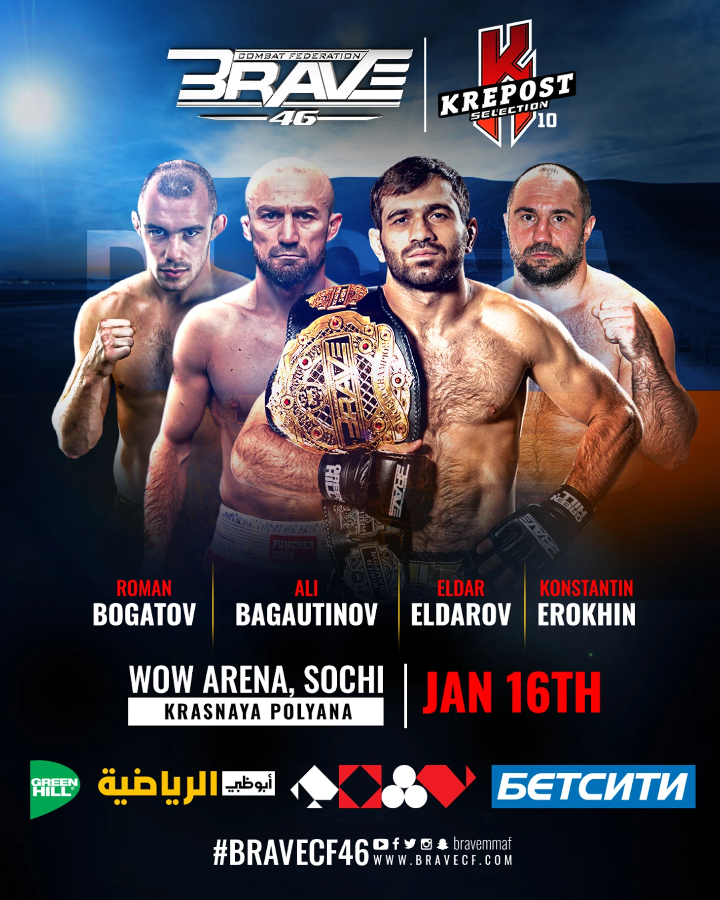 BRAVE CF 46 пройдет в Сочи на Красной поляне 16 января и будет проводиться совместно с промоушеном Krepost Selection. Ожидается, что в ближайшие недели будет объявлено больше подтвержденных спортсменов и пополнение файткарда интересными бойцами.