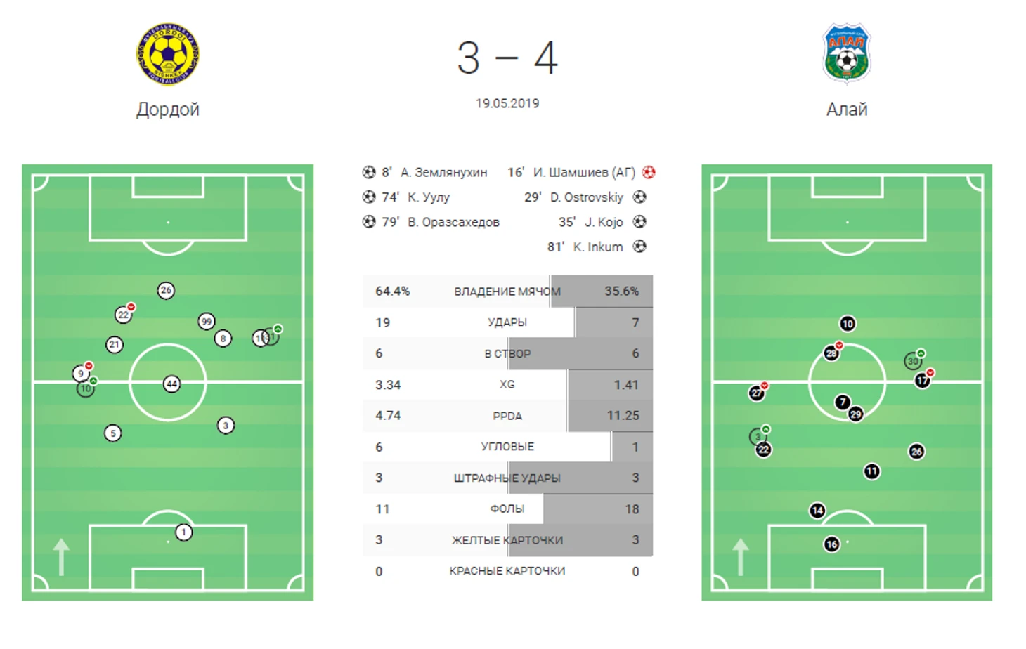Голы: Землянухин 8 (П), Жыргалбек уулу 74, Оразсахедов 80 (П) – Шамшиев 16, А/Г, Островский 30, Кожо 35, Инкум 81.