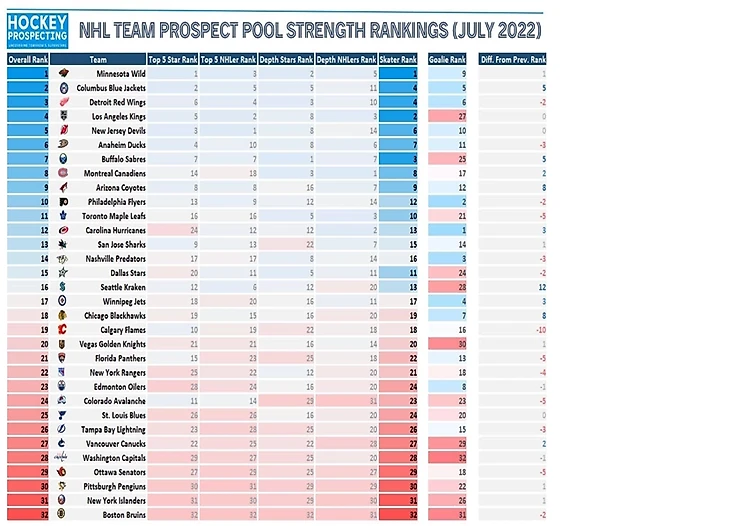 Поэтому действия Герина, пусть их было и мало, можно положительно и адекватными стратегическому вектору развития, которое было принято в момент выкупа Паризе-Сутера. Текущей главной задачей менеджмента «Миннесоты» будет удержание основного костяка команды и ввод талантливой молодёжи, собранной на последних драфтах, чтобы по истечению 3-х лет штрафов обладать хорошим базовым составом для серьезных задач. На последнем инструменте достижения успеха «Миннесоты Уайлд» хочется остановиться более подробно. Нынешним летом аналитический сайт https://hockeyprospecting.com, специализирующийся на градации главных хоккейных талантов планеты, представил рейтинг команд НХЛ (внимание на фото) по силе пула проспектов, согласно которому «дикари» занимают сейчас первое место.
