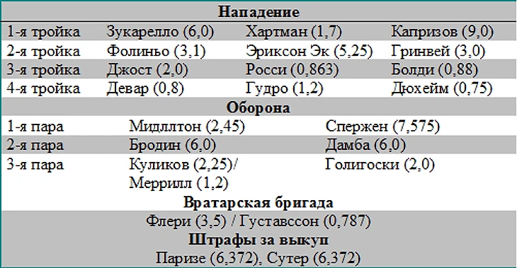 За прошлую регулярку сформировалось 2 ударные тройки, где Капризов и партнеры - это основная сила атаки, а вот звено Эриксона Эка представляет собой одно из лучших сдерживающих звеньев в конференции. Перспективы попадания в плей-офф ближайшего сезона зависят от дальнейшего прогресса Болди и того сумеет ли реализоваться Марко Росси - главный атакующий проспект команды, чтобы составить еще одно креативное звено. Дополнением к этим ребятам идет Джост, который показывал хорошие перспективы в «Колорадо», но учитывая мощь команды и проблемы с потолком был обменян. В обороне напарником капитана должен остаться, продленный на 3 года, габаритный Миддлтон, которые балансово сочетались в прошлом году. Вторая пара защитников также смотрится очень прилично, хотя Дамба может покинуть команду в дедлайн, так как в следующем году его контракт с повышением воткнуть будет тяжело – все то же что и по истории с Фиалой. В третьей паре есть выбор между нестареющем Голигоски, перезагрузившим карьеру в составе «дикарей» Куликовым, и продленного на 3 года Меррила. При этом помним про солидный перечень проспектов-защитников. Флери при доверии и фарте может стать опорой «Миннесоты» в ближайшем будущем, пока растет потенциальны топ-вратарь – Валльштедт.