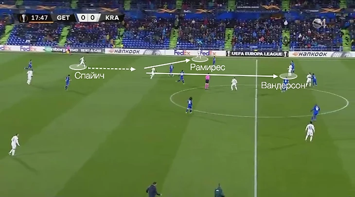 Спайич освобождался за счёт «челночных» передач Крицюка, продвигался с мячом через свободный полуфланг, далее отдавал пас либо на Рамиреса, либо на Вандерсона. Вильена больше работал на подборах и не рассматривался как основная пасовая цель.