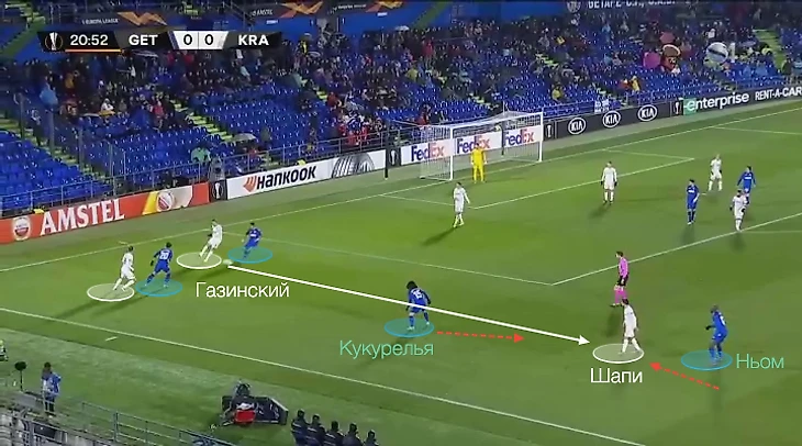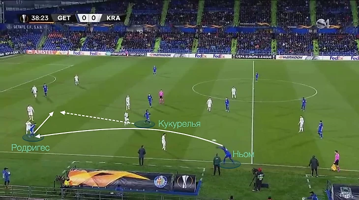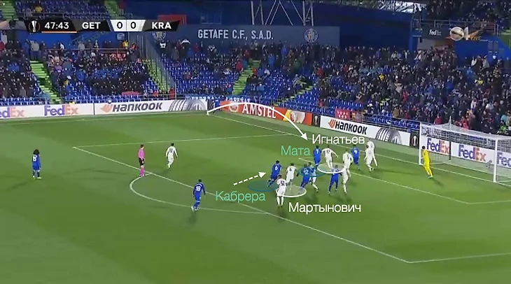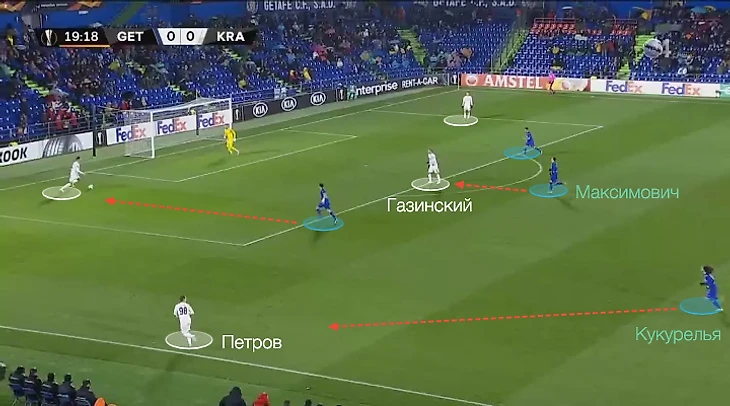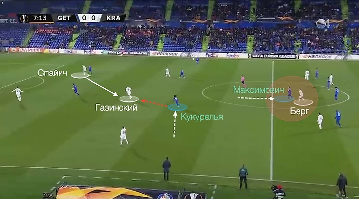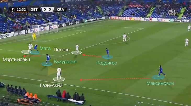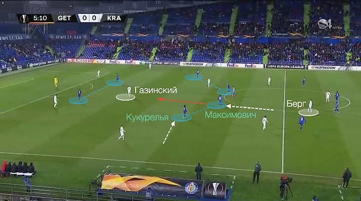 «Хетафе» легко запрессинговывал главную билдап-тройку гостей Мартынович-Петров-Газинский, перекрывая любые возможности переключения фланга. Тут мы видим ситуацию 3-в-4. Помощи от Вильены или Берга не предполагается даже в теории.