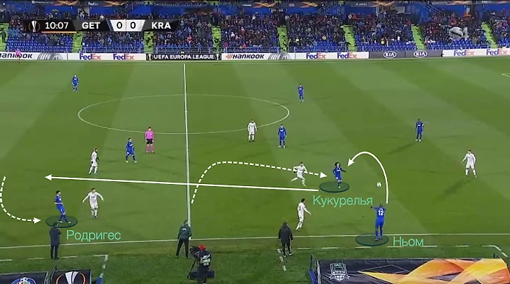 Ньом также может выбрасывать аут в сторону Родригеса вдоль фланга. Тогда следующим адресатом становится всё тот же Кукурелья.