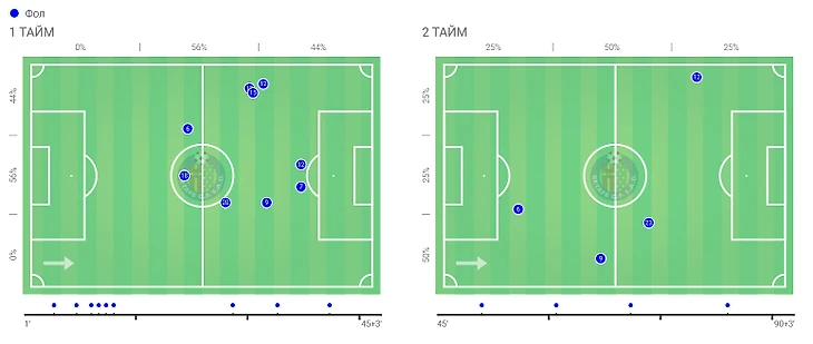 Лишь 4 фола из 13 хозяева совершили на своей половине (для сравнения «Краснодар» - 10 из 16), 6 фолов на флангах плюс два фола перед штрафной соперника. 6 фолов в первые 12 минут игры, ни одной жёлтой карточки.