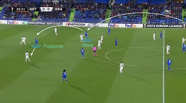 «Хетафе» в свою очередь с мячом действовал максимально прямолинейно, но с неотвратимостью отбойного молотка. Никакого короткого паса от вратаря. Сория играл строго выносом на двух центральных нападающих - Родригеса (9 передач) и Мату (4 передачи). Немудрено, что лучший момент первого тайма возник именно после их взаимодействий: