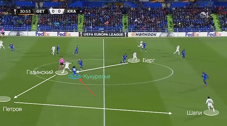 Кукурелья при этом продолжал страховать центральную зону, включаясь в прессинг по Петрову из глубоких позиций.