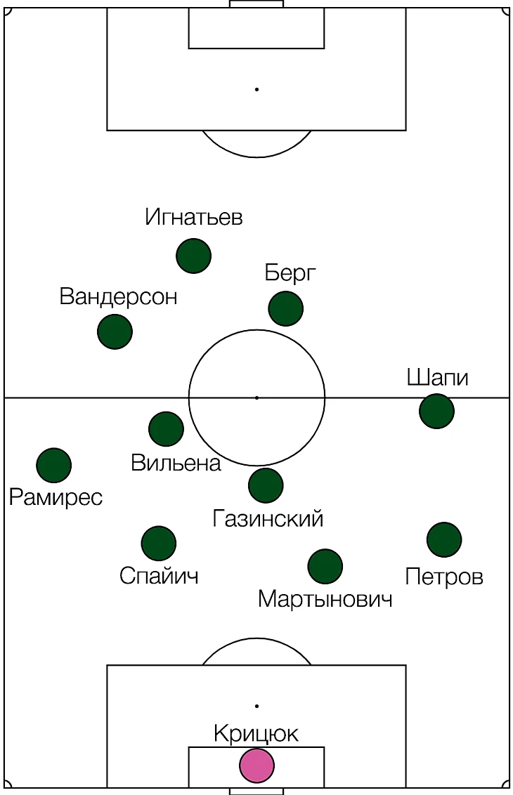 Пепе Бордалас, разумеется, не отошёл от своих плотно сбитых 4-4-2 с высоким прессингом, поработав лишь над деталями. В первую очередь, дело коснулось расположения и перемещений Кукурельи с Максимовичем. Крайний полузащитник Кукурелья изначально занимал достаточно глубокую и узкую позицию, срываясь на фланг лишь в момент паса на Петрова. Максимович перемещался в центральном вертикальном канале между Газинским и Бергом. Швед играл чуть в оттяжке по сравнению с Игнатьевым: