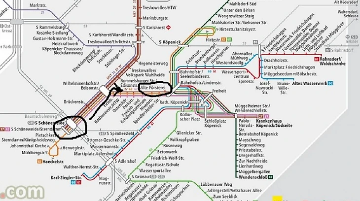 Моим же планом было добраться до станции «Berlin-Spindlersfeld», воспользовавшись S47, которая находится рядом с исторической частью Копеника (это горчичная линия и обозначена кружком в правой части карты). К сожалению, моим планам было не суждено сбыться, так как доехав до станции «Schoneweide» пассажиром было сообщено, что поезд дальше не идет. Платформа была перекрыта милицией и необходимо было добираться до старого города или прямо до стадиона – на трамвае. Не смотря на то, что до игры еще было около трех часов, людей на остановке было уже очень много, а трамваи ходили не часто. Поэтому через 30 минут стало понятно, что рисковать не стоит и лучше ехать сразу до «Старого лесничества» на трамваях 27,63 или 67. В пути около 20 минут от станции «Schoneweide».