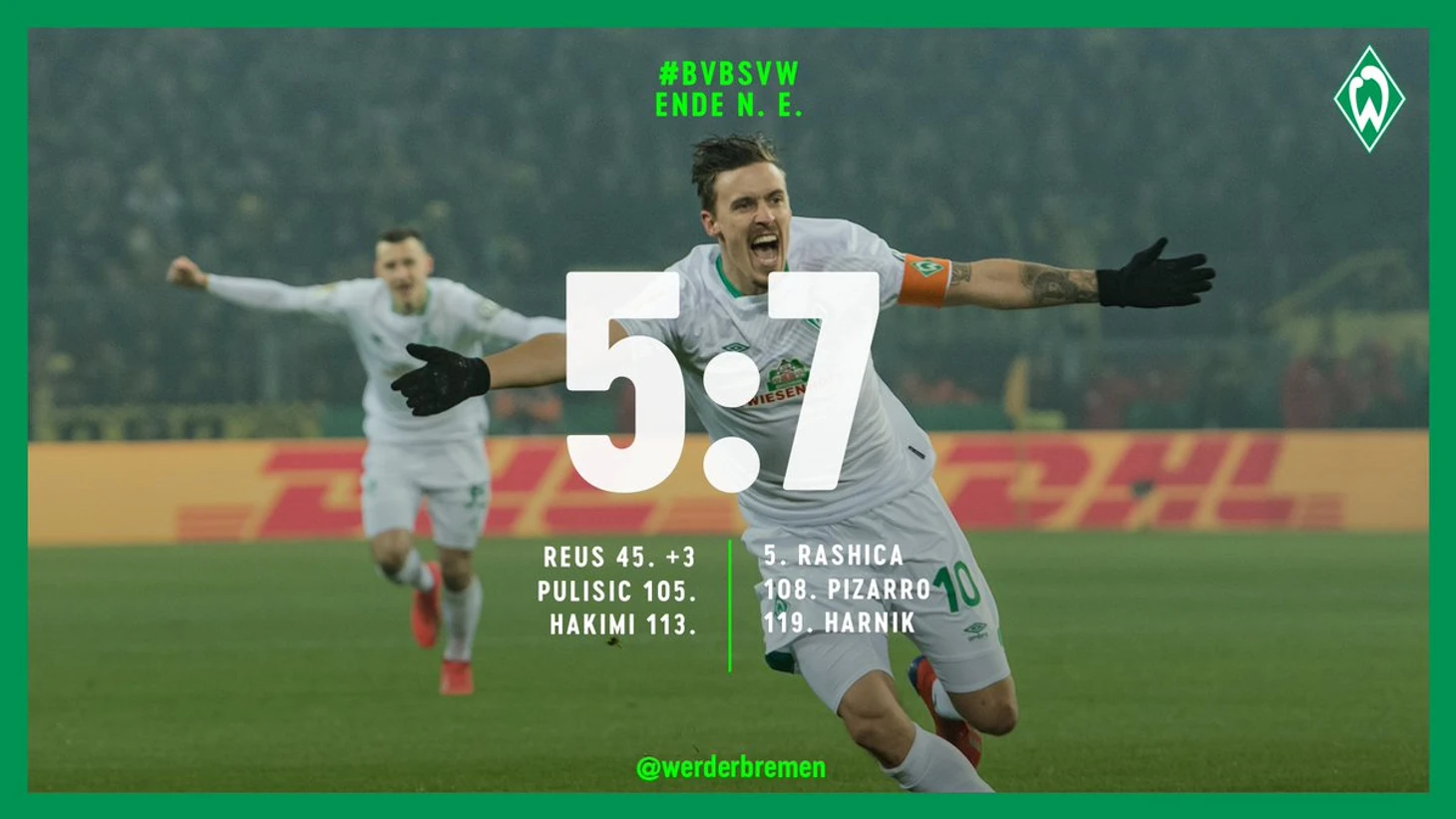 Если кому-то сказали бы накануне, что кубковая игра Дортмунда с «Вердером» завершится со счетом 3:3, он вряд ли бы удивился: счет довольно типичный и для Бундеслиги в целом, и для этих команд конкретно. Но вот сценарий, по которому команды пришли к этим 3:3, предсказали бы, я думаю, не многие.