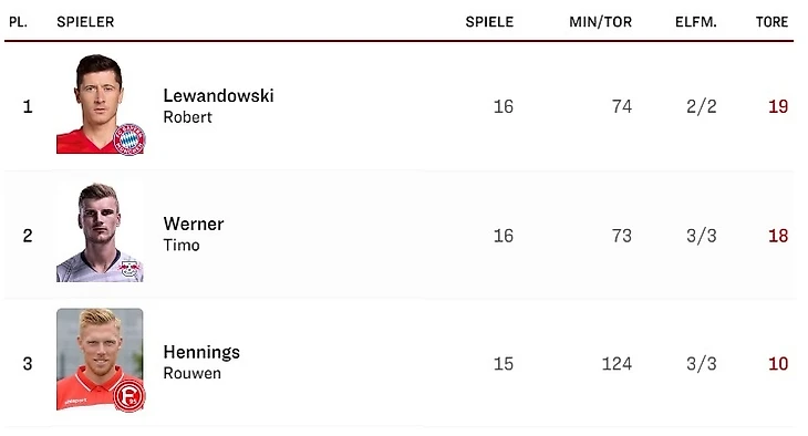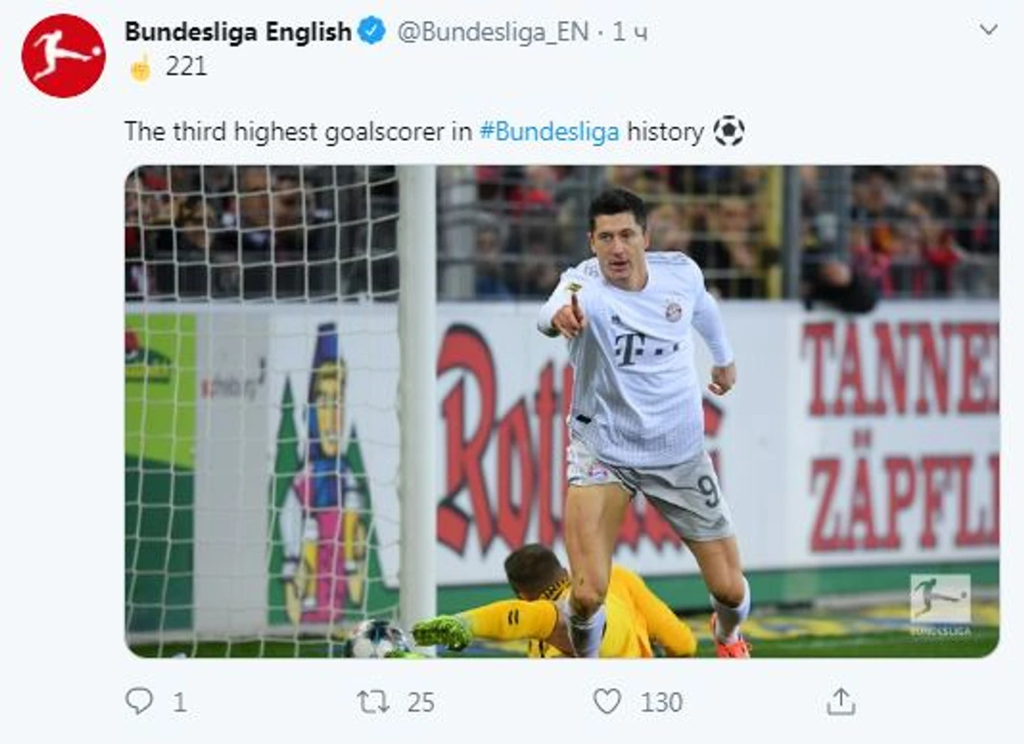 Левандовски забил 221 гол в Бундеслиге, и теперь он поднимается на третье место в списке лучших бомбардиров за все время. Его опережают только Герд Мюллер (365) и Клаус Фишер (268).