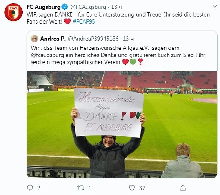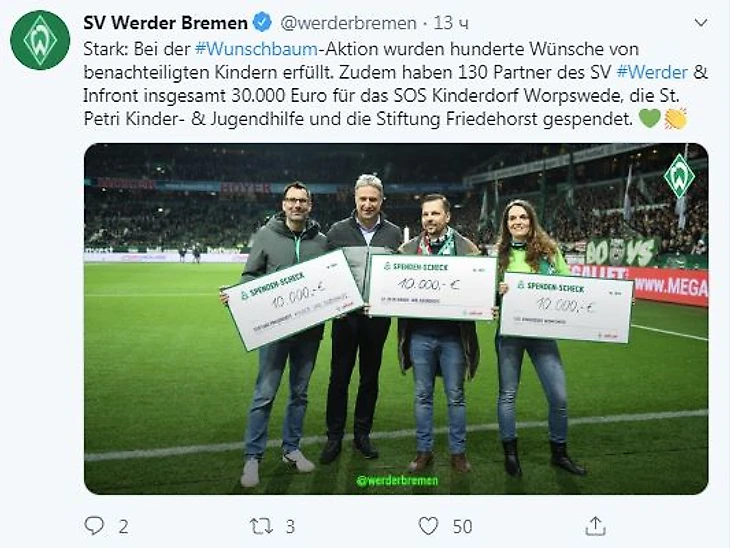"Старк: На акции #Дерево желаний были выполнены сотни желаний обездоленных детей. Кроме того, 130 партнёров Социального страхования #Вердер & Infront пожертвовали в общей сложности 30 000 евро детской деревне Ворпсведе, Детско-юношеской помощи Св. Петра и фонду Stiftung Friedehorst".