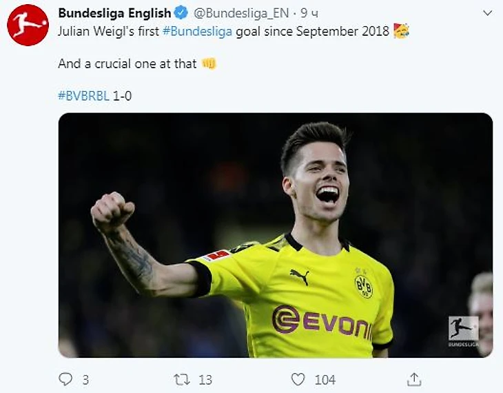 "Первый гол Джулиана Вейгла с сентября 2018 года! И ещё решающий!"