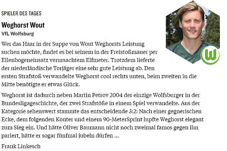 Тем не менее, главным героем субботнего вечера суждено было стать все-таки голландцу, который за двадцать минут до конца матча забил третий и стал первым игроком в истории «Вольфсбурга», оформившим три хет-трика в Бундеслиге.