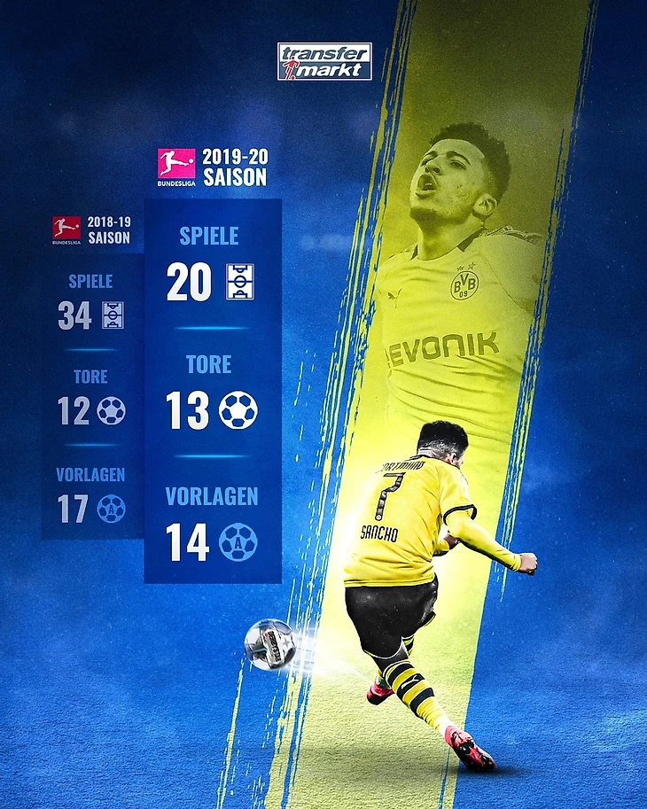 Джейдон Санчо забил уже больше голов (13), чем за весь прошлый сезон (12).