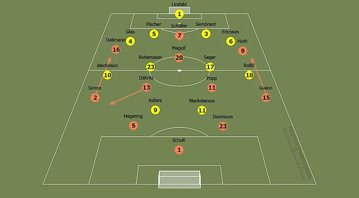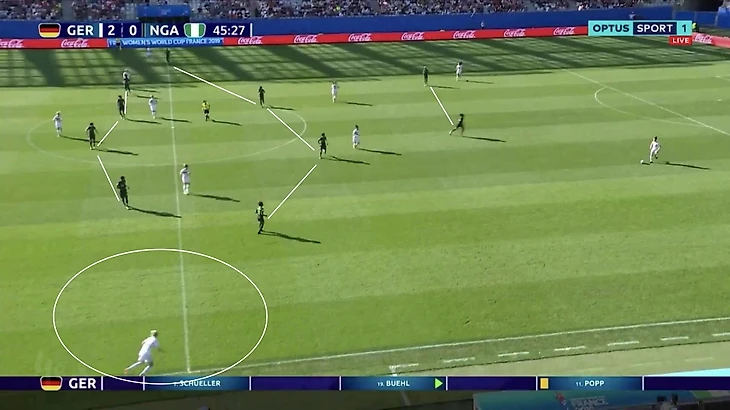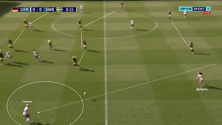По оборонительному построению Швеция напоминала сборную Нигерии, поэтому Германия использовала в атаке тот же приём: Симон широко располагается на фланге и открывается для передачи. Разница в том, что со Швецией позицию Симон страховала Дебриц: