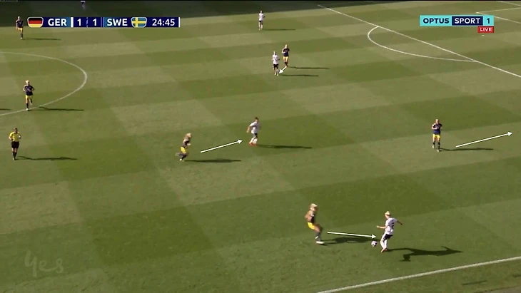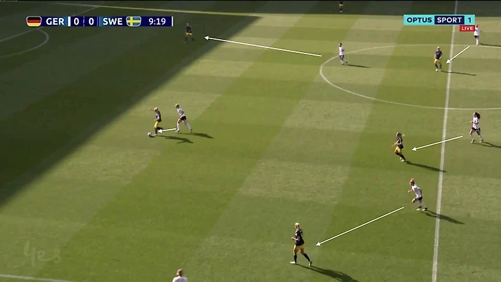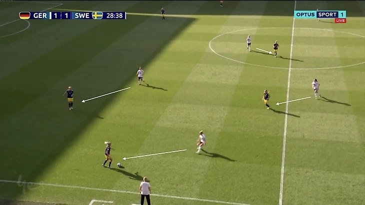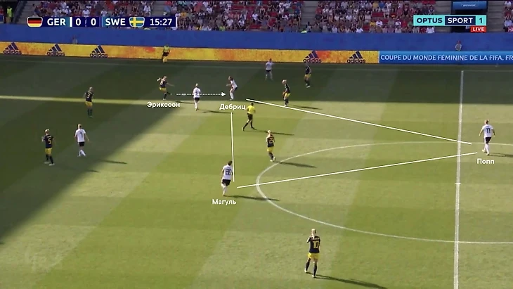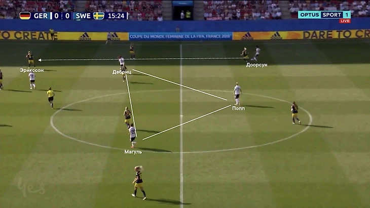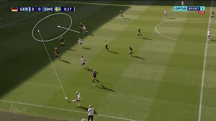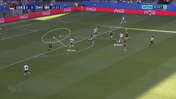 Эрикссон пытается отдать пас партнёру. Ситуация для Германии потенциально опасная. Если бы Дебриц не прервала передачу, Швеция могла бы убежать в быструю атаку большим числом на свободном пространстве: