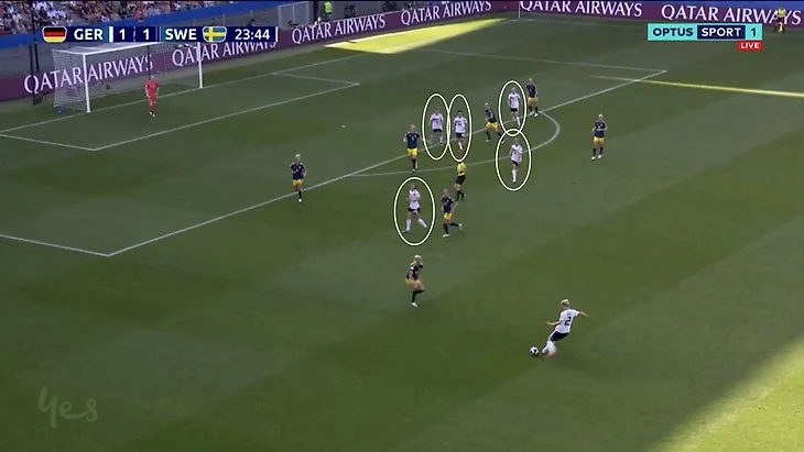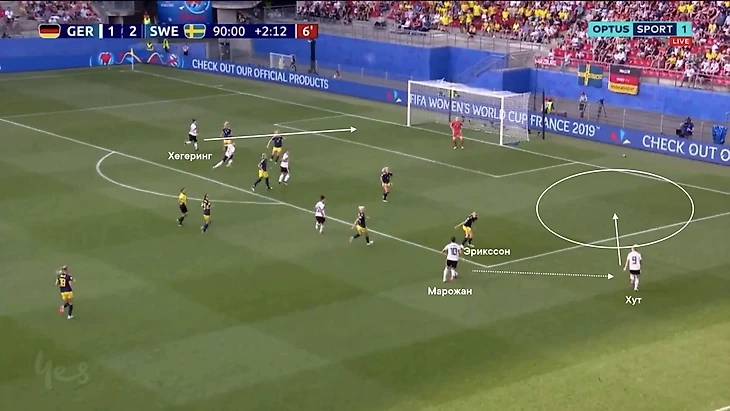 После того как Швеция сравняла счёт, атака Германии практически исчезла. И в целом к действиям немок на чужой трети были вопросы. Например, неоптимальное расположение игроков в завершающей стадии. В этом эпизоде потенциальные адресаты для обострения располагаются слишком кучно, хотя фланги свободны, поэтому передача в любом случае пойдёт в борьбу: