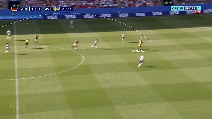 Даже численное преимущество не спасло немецкую команду от пропущенного гола. После навеса Якобссон и паники в штрафной Блакстениус вывела Швецию вперёд: